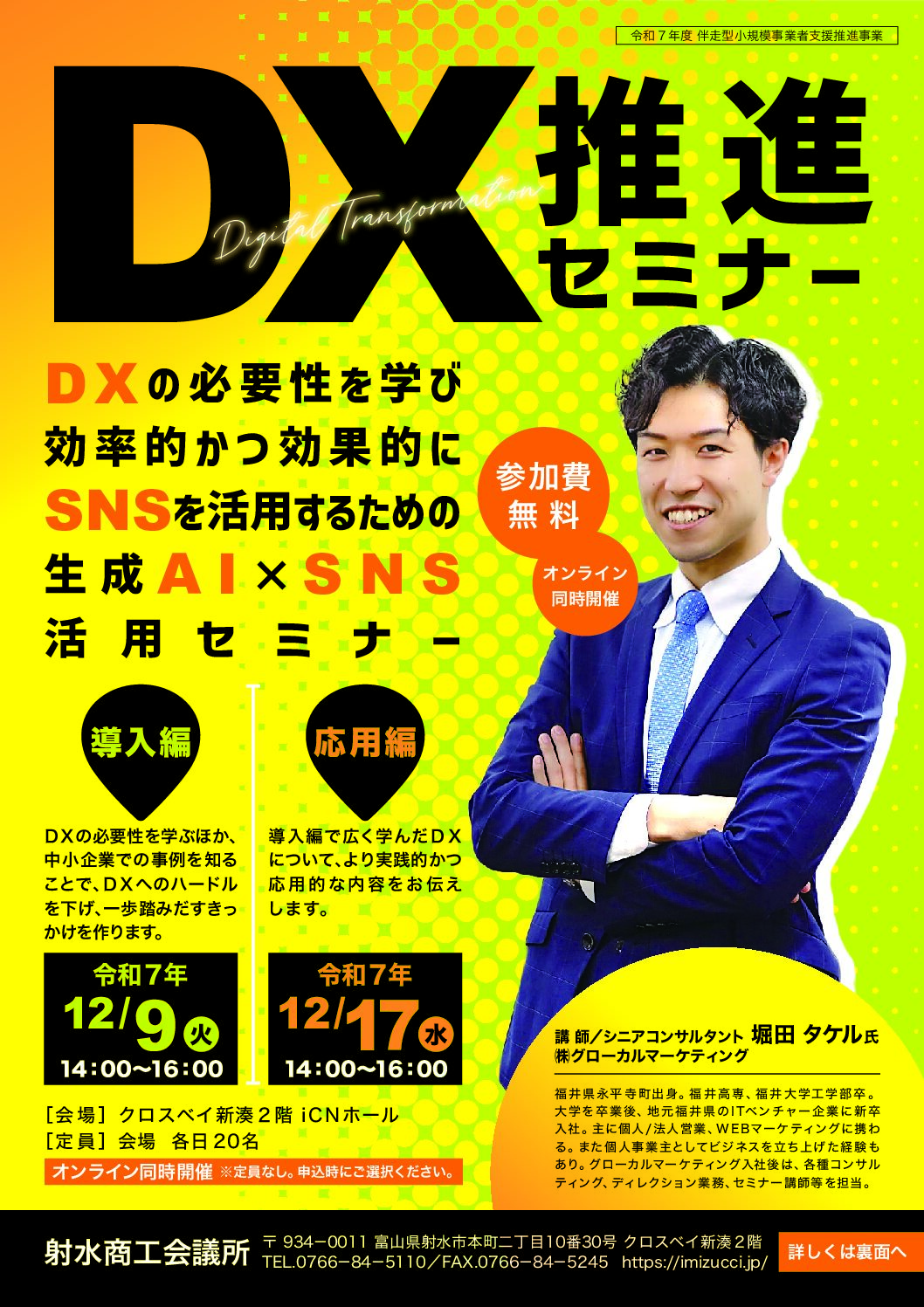 本所では伴走型小規模事業者支援推進事業として、DXの必要性を学び効率的かつ効果的にSNSを活用するための生成AI×SNS活用セミナーを開催します。