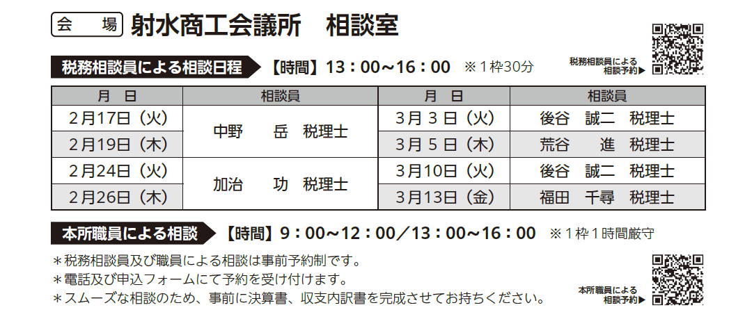 2月16日(月)より決算の方法、決算書・確定申告書の書き方、消費税申告書の書き方、その他の納税申告についての税務相談を税理士及び経営指導員等が各種相談無料で行います。混雑が予想されますので、事前予約をお願いしております。